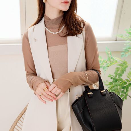 首の上まで覆うフィット感が、首の太さにもよるだろうけど、良いように出るかどうか悩みどころでしたが素材のツヤっぽさに惹かれ‥