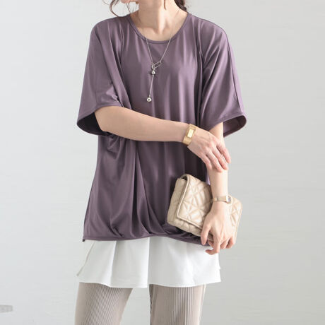 てろんと落ちる「とろみ感」が上品で心地よい!サラリとした手触りのトップスの登場です。首元はVネックで首元すっきりとした印象に。裾はタケノコタックで余裕を持たせて気になるお腹周りもすっきりカバーします。接触冷感でしわになりにくいのもポイントです。シンプルなデザインなので小物で雰囲気を変えたり、オフィスコーデにもお勧めです。