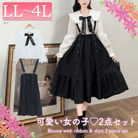 【大きいサイズ】 リボン付きブラウス&サスペンダースカート2点セット 大きいサイズ レディース 春服