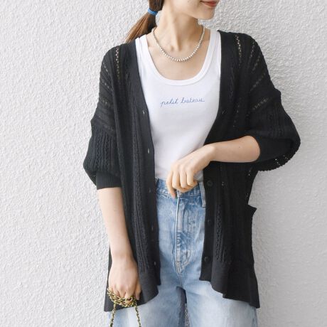トレンド感のある透かし編みがポイントのニットカーデ。