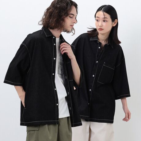 配色ステッチがポイントのブラックデニム半袖シャツです。