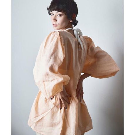 程よいパフスリーブにボタン、ウエスト紐付きで締めてミニドレス、開けて羽織になるガウンです。