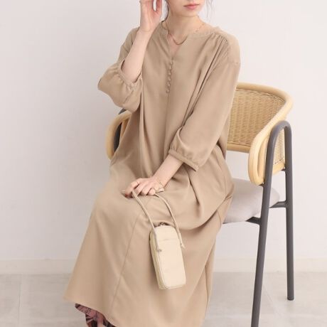 開きすぎないネックラインと小さなボタンが印象的なワンピース。