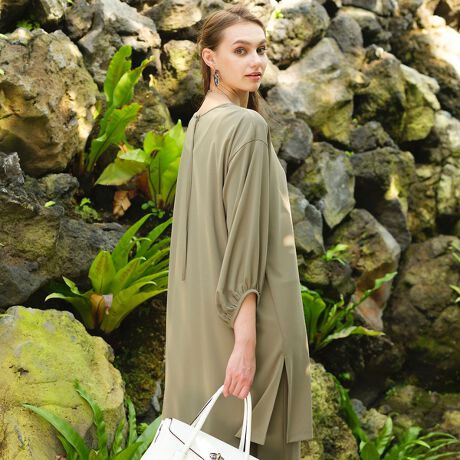 一見シンプルなチュニックに見えますが、袖にはギャザーをたっぷり入れてふんわりと女性らしさのあるディティールをアクセントに。後衿部分には共布リボンを垂らしてアクセント。リボンは取り外しも可能です。