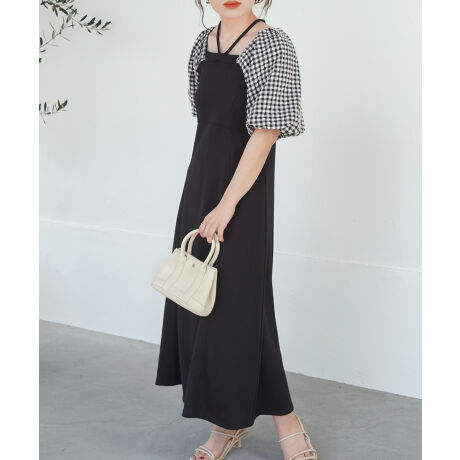 ボリュームのあるパフスリーブが素敵なワンピースです。スクエアネックになっていてデコルテが綺麗に見えます。首元にはワンピースと同じ素材のリボンを付けることができます。リボンはクロス、前後でリボン結び、チョーカーみたいにすることが出来ます。ハイウエストに切り替えのラインデザインがあるので、スタイルアップに見えます。袖にはワンピースと同じ素材で裏地が付いているので、チクチクすることなく安心して着用していただけます。
