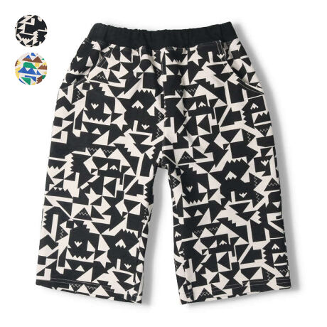 ポップな幾何学柄の総柄が目をひく膝丈5分丈のハーフパンツ。モノトーンでかっこよく着られるブラックと夏らしいカラフルな配色の2色展開。薄手のトレーナーのミニ裏毛素材。同じデザインのベビー、トドラーサイズはV31116になります。【アイテム】シンプル ベーシック カジュアル お洒落 オシャレ かっこいい かわいい 可愛い 普段着 お外着 お外遊び着 デイリーウェア お出かけ着 ハーフパンツ 短パン 半パン ボトムス 半ズボン 子ども こども 男児 男の子 ボーイズ キッズ ベビーサイズ トドラーサイズ 中学校 中学生 小学校 通園 通学 小学生 2023年夏物新作 丸高衣料 黒色 白色 ダディオダディ