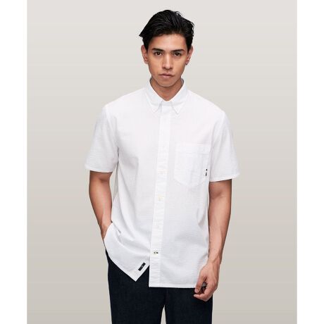 軽いテクスチャーのシアサッカーを使用したショートスリーブシャツ。シンプルなデザインで品のよさを保ちつつ、着こなしを爽やかな印象へと導きます。肩ヨーク下のセンターボックスタックでリラックス感のあるシルエットを構築。襟はボタンダウン仕様で、左袖にはフラッグロゴ刺しゅうが施されています。