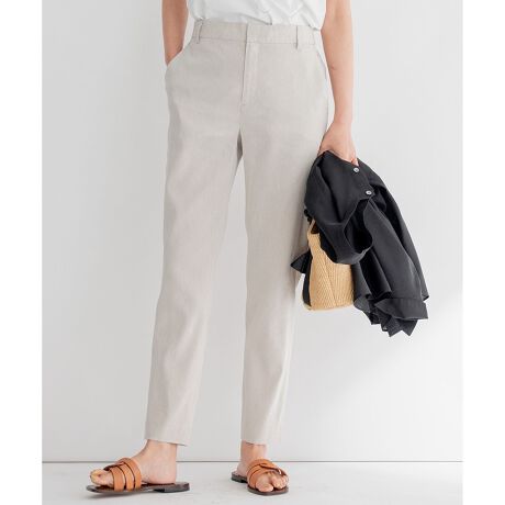 程よいゆとり感と後ろゴム仕様で、履き心地抜群のテーパードパンツです。前開き・ベルトループ付きのきちんとした仕様で、ヒールを履いてもパンツの裾が靴にかからない、絶妙なレングスに仕上げています。リネン混でさらっとした着心地の素材感が春夏にぴったりです。どんなトップスにも合わせやすい万能パンツで、ベーシックカラーから、履くだけで気分を上げてくれる華やかなカラーまで、カラーバリエーションも豊富に取り揃えております。同素材のジャケットとのセットアップ対応も可能です。 展開カラーは、女性らしく柔らかい色味のベージュ(#033)、合わせやすい定番のブラック(#005)、オンオフ使えるネイビー(#075)、落ち着いた印象のダークブラウン(#035)、クリーンなホワイト(#001)のベーシックな5色に加え、コーデが華やかになるイエロー(#040)、こなれ上品カラーのピーコックグリーン(#061)、そしてWEB限定の爽やかなブルー(#070)の華やかカラー3色を合わせた、計8色展開です。