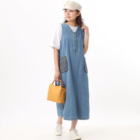 インナーに着るものを変えることでロングシーズン着られるVネックのワンピースです。