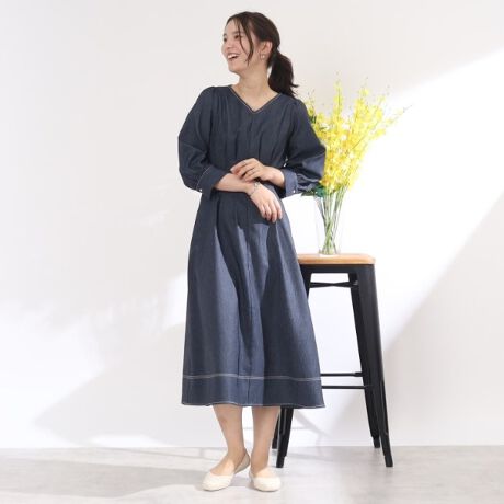 【美シルエットフィット&フレアーウエストゴムで楽ちんサイズ展開アリ】ポリエステルデニム風ワンピース