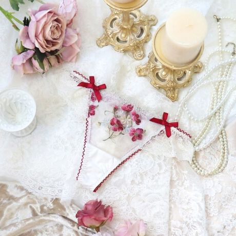 たくさんの花々をモチーフに、ツヤのある刺しゅう糸で立体的な印象に仕上げたデザインの「アン・マリー」。異なるステッチであしらわれた葉の模様や、色の入れ方にまでもこだわり抜いたシリーズです。レースの上辺は大きめな曲線のインケミ仕様で、着用した際に柄が肌へ浮かび上がり華やかさをプラス。両サイドにはリボンを、バック部分にもお揃いのアップリケを使用しました。2種類のラメ糸をポイントに、大人かわいいリサマリを表現しています。