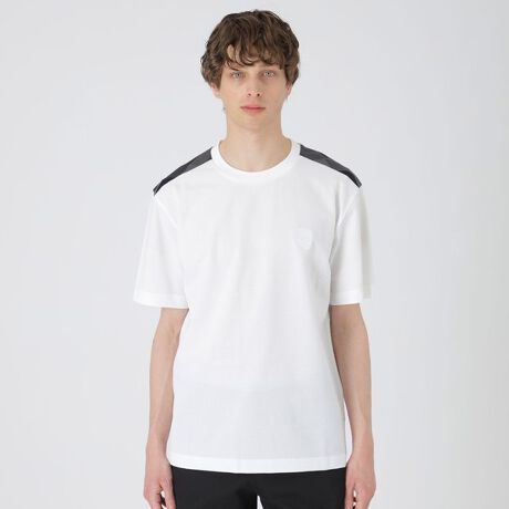 麻混のサッカー地Tシャツ。生地の凹凸感により肌離れが良く、清涼感あるアイテムに仕上がっています。肩部分にあしらったトーナルカラーのクレストブリッジチェックがアクセントになっています。