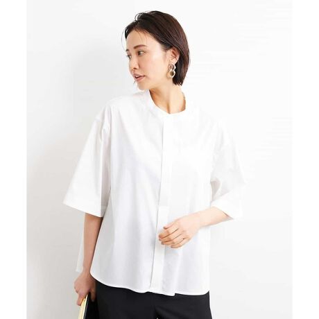 きちんと感があるのに、涼しく着られるゆったりサイズの前あきシャツブラウス。使いやすい五分袖シャツには、襟元のさりげない細幅の切り替えを入れ デザインアクセントを加えました。40サイズは限定店舗展開です。