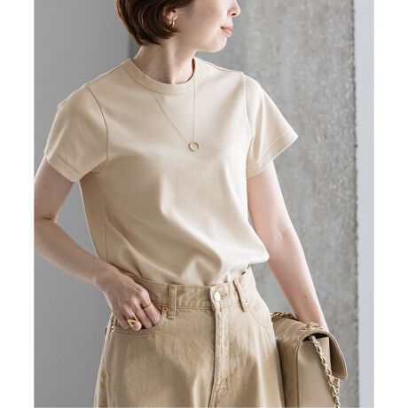 思っていた以上に肉厚な生地で、体型を拾いにくいTシャツでした。コンパクトな作りだけど、スッキリと見える気がします。首もしっかり詰まっていてむしろきついくらいです。つるっとした上品なツヤが高見えします。