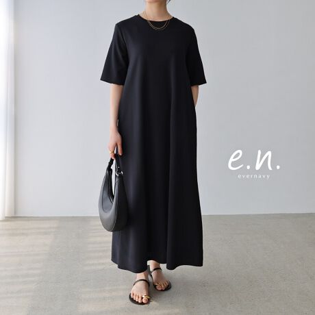 梨地ポンチ 5分袖 フレア ワンピース evernavy エバーネイビー