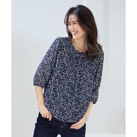 1枚着はもちろん、端境期はインナーとしても活躍する華やかな花柄カットソー。身頃は、シャツとジャージの2枚重ねで透けを気にせず着用できます。エアリーで繊細な小花柄がカジュアルさを抑え、大人フェミニンな雰囲気を演出。袖は布帛1枚で涼しく、袖下にゴムを入れているのでまくりやすく動きやすいデザインで、気軽に印象を変えられます。