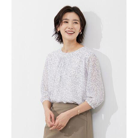 1枚着はもちろん、端境期はインナーとしても活躍する華やかな花柄カットソー。身頃は、シャツとジャージの2枚重ねで透けを気にせず着用できます。エアリーで繊細な小花柄がカジュアルさを抑え、大人フェミニンな雰囲気を演出。袖は布帛1枚で涼しく、袖下にゴムを入れているのでまくりやすく動きやすいデザインで、気軽に印象を変えられます。