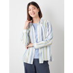 ワイドピッチのストライプ柄が大胆な前開きブラウス。綿麻のナチュラルな風合いと優しいカラーが相まって、コーディネートをやわらかくまとめてくれる1着。衿元のタックや後ろ身頃ヨークのギャザーで、女性らしいシルエットを演出。それぞれ同色系のボトムスと合わせてコーディネートするのが着こなしのポイントです。