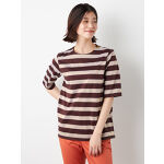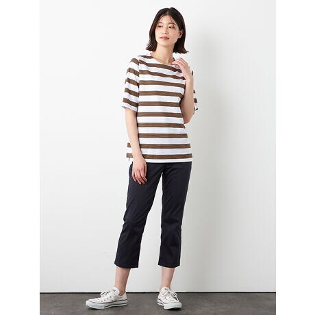 日本でも数台しかない機器を使って編み立てた、日本製ハイゲージボーダー素材。シルケット加工がほどこされ、毛羽の少ないさらっとした綿の風合いを引き出しています。素材の良さを活かし、シンプルなデザインにまとめ、見返し仕様のクルーネックがきちんと感を演出。ワイドパンツにもストレートパンツにも合わせやすい丈バランスで、太幅のボーダーが1枚で着ても様になる存在感です。