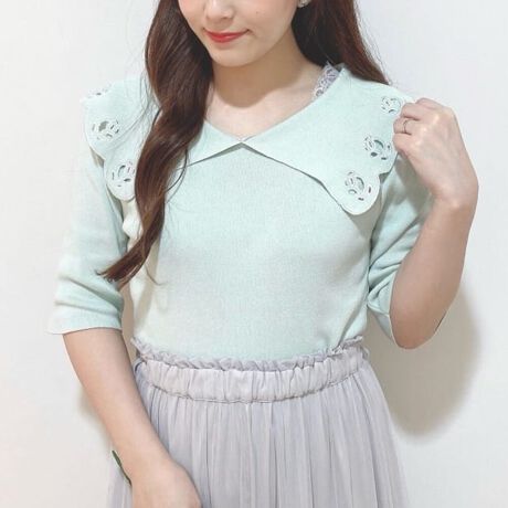 ローズのカットワークがあしらわれたビッグカラーが目を惹くニットプルオーバー。