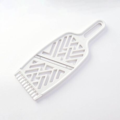 1台3役のスライサー万能調理器です。表面はスライサー、裏面はおろし器、先端部では野菜の飾り切りができます。
