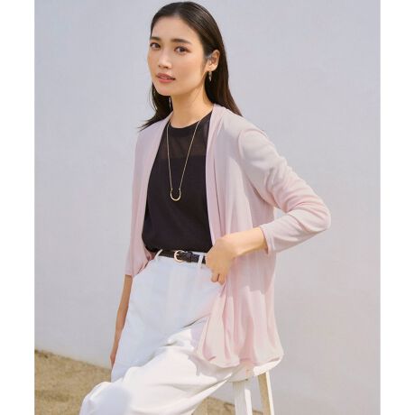 UVケア、接触冷感を兼ね備えた機能性素材シリーズ。シャリ感をプラスして暑い夏も快適に過ごせるようにした、こだわりの日本素材です。細いレーヨンの糸にポリエステルをカバーリングし、ストレッチ性に富んだフライス編みで作られています。独特のドライタッチ感と光沢感が特徴で、キックバックも良く、着心地抜群です。シワになりにくい素材なのでバッグの中に入れて気軽に持ち運ぶことができます。通勤などデイリーから旅行まで、大活躍の羽織りです。ご家庭で手洗いできるのも嬉しいポイント。