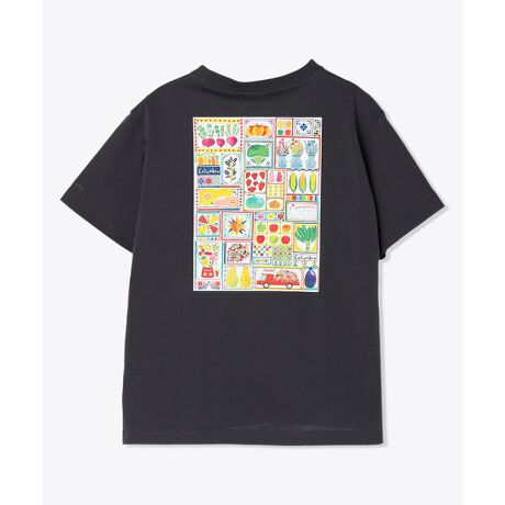 壁画や絵本などで活躍するアーティスト河野ルルさんのグラフィックを背面にプリントしたTシャツ。ポートランドのファーマーズマーケットから着想した野菜や花などの自然を感じるモチーフに優しいタッチとポップで明るい色彩からマーケットの楽しさが感じられます。