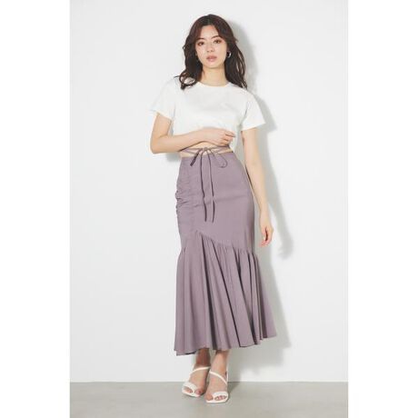 【ウエストの紐デザインがY2Kファッションを楽しめるマーメイドスカート】【Design】肌見せを楽しみたい、そんな願いが叶うマーメイドスカートです。紐は2通りの付け方が出来て、無しでも着用可能なので、様々な着方をお楽しみ頂けます。前の内ボタンに2本とも紐を付けてウエストに巻き付ける両サイドの内ボタンに1本づつ紐を付けてウエストに巻き付ける紐を全て外してINやOUTスタイルでも着られる合わせるトップスやスタイリングで自分の着方を見つけて欲しいです。テンセル調の絶妙なとろみと艶感のある表地が、デイリーに着易く女性らしい印象を与えてくれます。裾にたっぷりと寄せたギャザーが動く度に脚元にニュアンスを生み出してくれるのもPointです。【Color】女性らしく大人っぽい雰囲気を醸し出すL/BRN、今年らしい甘すぎない抜け感の出るPNK、大人っぽく凛とした印象のBLU、モードかつセンシュアルなスタイルを叶えるBLK、の4色展開です。