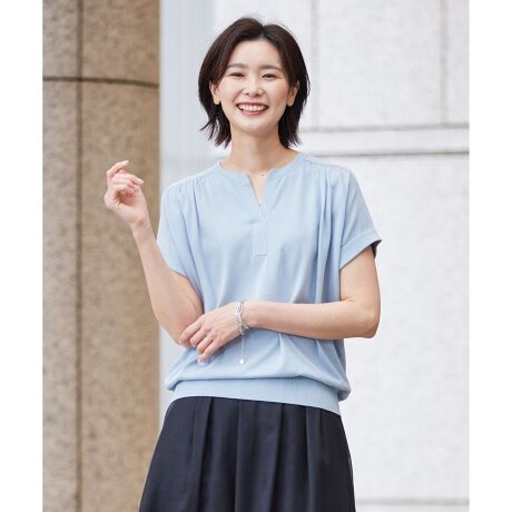 ブラウスのようなきちんと感のあるバンドカラーニット。首元がすっきりと見えるデザインのため、ニットでも重たく見えず、さらにサラッとした素材を使用しているため夏まで快適に着ていただけます。肩の部分に入れたギャザー切り替えもハイゲージのニットで表現し、甘くなりすぎず大人っぽい印象に仕上げました。裾はインでもアウトでも着られるため、ワイドパンツやフレアースカートなどとも好相性◎。お仕事着にもお出かけ着にも着回せる、1枚で決まるアイテムです。