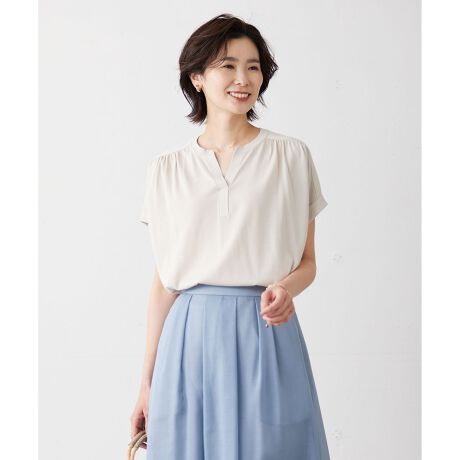 ブラウスのようなきちんと感のあるバンドカラーニット。首元がすっきりと見えるデザインのため、ニットでも重たく見えず、さらにサラッとした素材を使用しているため夏まで快適に着ていただけます。肩の部分に入れたギャザー切り替えもハイゲージのニットで表現し、甘くなりすぎず大人っぽい印象に仕上げました。裾はインでもアウトでも着られるため、ワイドパンツやフレアースカートなどとも好相性◎。お仕事着にもお出かけ着にも着回せる、1枚で決まるアイテムです。