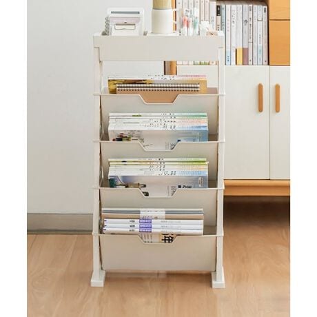 【大容量で収納力抜群】5段の間仕切り設計された、書籍、雑誌、ノート、料理本、辞書、漫画本、フォルダ、文房具、テーブルパーツを一口にまとめて収納できます。上トレイは小物を置くのに便利です。テーブルを美しくします。「見せる収納」として考えれられる方にはお勧めです。