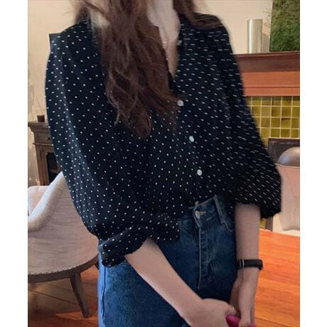 レディース 小粒ドットとパールシャル風ボタンのブラウス