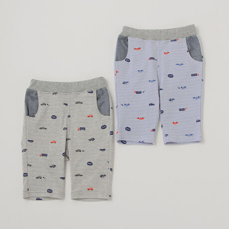 ミジンボーダーに乗り物の総柄プリントをあしらった6分丈パンツです。前ポケット口と後ろポケットをダンガリー素材で切り替えてメリハリを出しました。ウエストは肌あたりの良い素材にしてストレスのないはき心地に。足元がもたつかないレングスなので、スニーカーやソックス合わせもいろいろ楽しめます。【おすすめの着用時期は春夏シーズン】【透け感】透けない【生地の厚さ】普通【伸縮性】あり【裏地】なし【ポケット】あり【アジャスター】あり