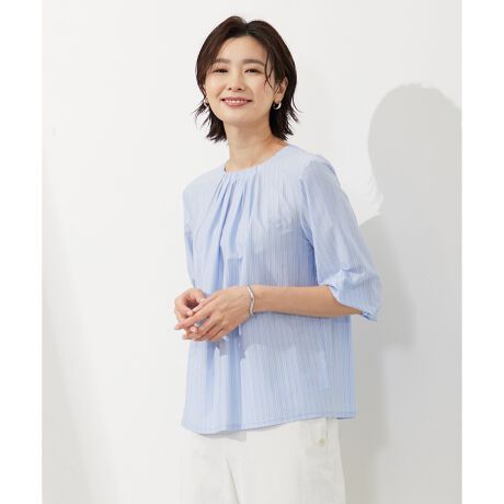 ゴムギャザーを入れた衿がデザインのアクセントになったストライプカットソー。袖口にタックを入れてボリュームを出し、柔らかく女性らしい印象に仕上げました。合わせるアイテム次第でカジュアルからキレイめまで、幅広いコーディネートを楽しめます。