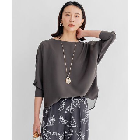 気になる二の腕回りをカバーしてくれるドルマンスリーブのデザイントップス。繊細に編み立てたリブ仕様の袖口にしており、たくし上げた際にも決まりの良いデザインになっております。後ろの裾にはシアー素材の切り替えを施し、レイヤード風のバックスタイルにしている所もデザインポイントです。カラーはシックなネイビー(#075)、なじみの良いベージュ(#033)、洒落感のあるグレー(#004)の3色展開です。