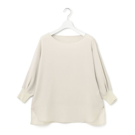 気になる二の腕回りをカバーしてくれるドルマンスリーブのデザイントップス。繊細に編み立てたリブ仕様の袖口にしており、たくし上げた際にも決まりの良いデザインになっております。後ろの裾にはシアー素材の切り替えを施し、レイヤード風のバックスタイルにしている所もデザインポイントです。カラーはシックなネイビー(#075)、なじみの良いベージュ(#033)、洒落感のあるグレー(#004)の3色展開です。
