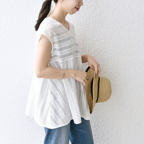 透け感のあるアイレット生地は、インナー次第で雰囲気を変えていただけます。
