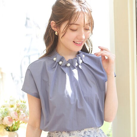 ギャザーネックパール調デザインブラウス