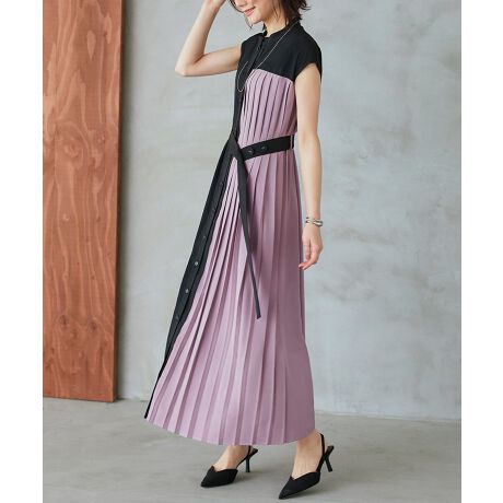 バイカラーにプリーツが印象的な前開きワンピース。共生地のベルトでウエストマークすることですっきりとスタイルアップが叶います。
