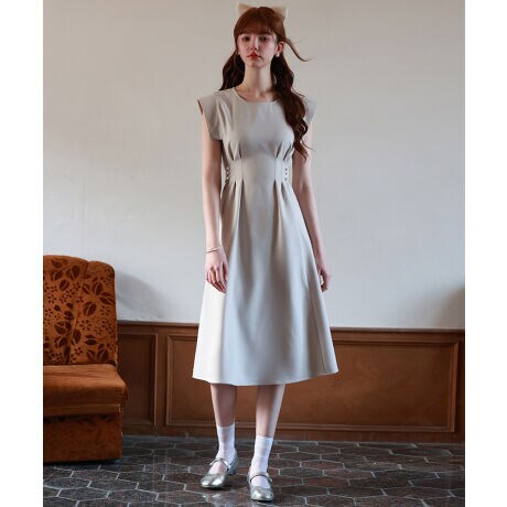 ウエストタックとウエストマークで女性らしいシルエットをつくるノースリーブワンピースです。