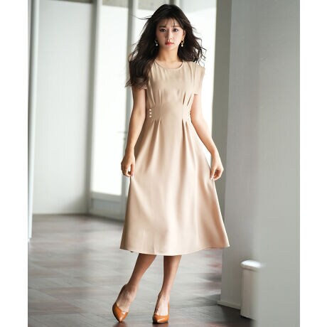 ウエストタックとウエストマークで女性らしいシルエットをつくるノースリーブワンピースです。