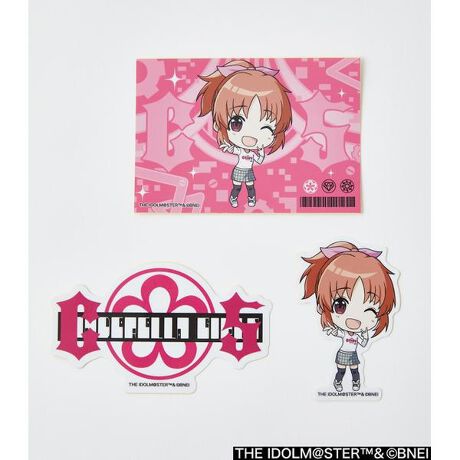 SD描き起こしイラストを使用したステッカーセット。 1枚で存在感のある背景付きのステッカー、アイドルがダイカットされたステッカー、ユニットロンTのデザインステッカーとお好きなデザインをご自由に貼って遊べるセット。