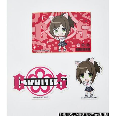 SD描き起こしイラストを使用したステッカーセット。 1枚で存在感のある背景付きのステッカー、アイドルがダイカットされたステッカー、ユニットロンTのデザインステッカーとお好きなデザインをご自由に貼って遊べるセット。