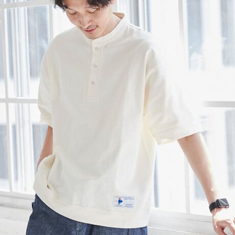 ヴィンテージ風の生地とイマドキなリラックスシルエットのスタンドカラーTEE。