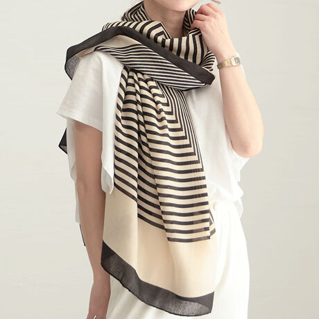大人の雰囲気が漂う幾何柄の大判ストールです。シックな色合いの柄で、コーデを品よく仕立て上げてくれます。大判サイズなので、多様な巻き方を楽しめ、アレンジは無限☆カジュアル、オフィスコーデにも馴染むので着回し力も抜群。これからの季節、紫外線や冷房対策に活躍してくれます。