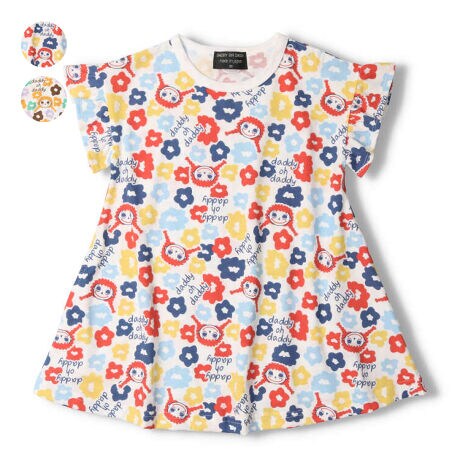 ダディオダディの人気の女の子のキャラクターのダディコちゃん。お花とダディコちゃんのカラフルな総柄プリント入りのワンピース。Tシャツ素材で楽ちんに着られます!フリルの袖も女の子らしいポイント!安心の日本製でギフトやプレゼントにもオススメ。(ベビーサイズのみ肩ボタン仕様になります。)【アイテム】半袖 トップス シンプル ガーリー フェミニン カジュアル お洒落 オシャレ かわいい 可愛い 普段着 デイリーウェア お出かけ着 お外着 お外遊び着 子ども こども 女児 女の子 ガールズ キッズ ベビーサイズ トドラーサイズ 幼稚園 保育園 小学校 通園 通学 小学生 2023年夏物新作 丸高衣料 コットン100% 綿100% made in Japan メイドインジャパン 国内生産