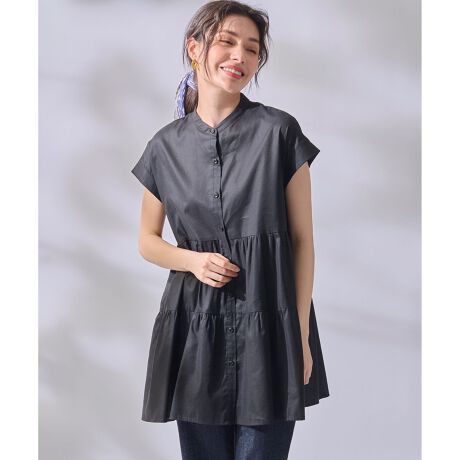 デザイン・ギャザーを細かく入れ、大人っぽいシルエットにこだわったティアードがポイント・ヒップ周りまで隠れる着丈も魅力・首元はすっきりとしたバンドカラーで、清潔感のある印象に