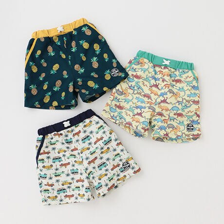 夏のプールや水遊びに大活躍するスイムパンツです。プティマインで人気の総柄デザインを採用したアソート展開。ウエストやポケット口を無地で切り替えて、にぎやかな雰囲気を程よく引き締めています。ブルマ型の裏地つきで肌へのこすれが軽減できるのも魅力です。【透け感】透けない【生地の厚さ】普通【伸縮性】なし【裏地】なし【ポケット】あり【アジャスター】あり
