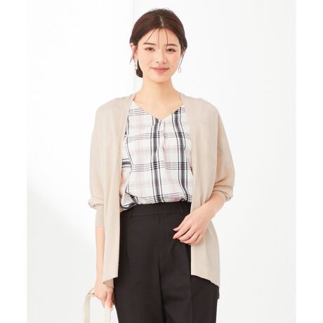 ■素材上質な細番手のレーヨン、ナイロン糸でサラサラとした素材感が特徴。薄手で清涼感があり、UVケア機能付きなので夏にぴったりな羽織アイテムになっています。