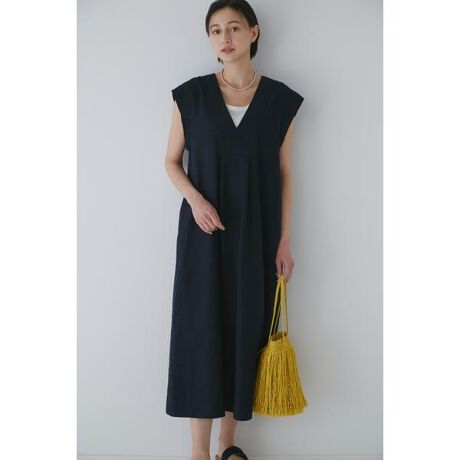 深めのVネックデザインは、ヨーク切り替えを後ろまで続けることでセーターカラー風に仕上げています。リラックス感のある着心地ながらシルエットをすっきりさせることで、きれい目のスタイリングも叶うワンピースです。